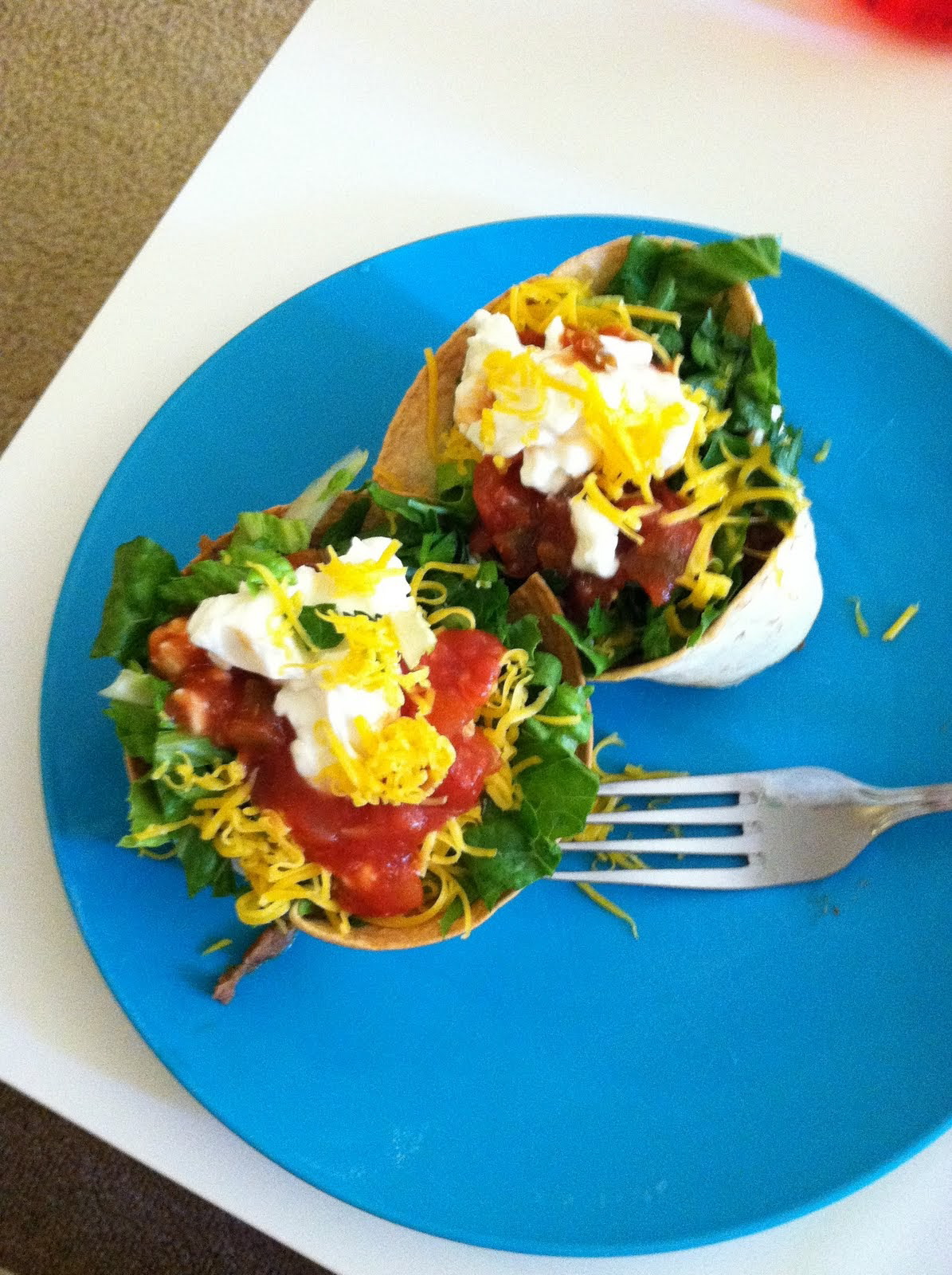 I adapted a recipe and since I hate reading directions, I just looked at the ingredients and tried to do my own thing with them using what I have. They looked so cute and yummy! The best part was that they were small enough to pick up and eat 🙂 Inside the tostada: cooked ground turkey, re-fried beans, lettuce, grated cheese, sliced other half of tomato, sour cream.