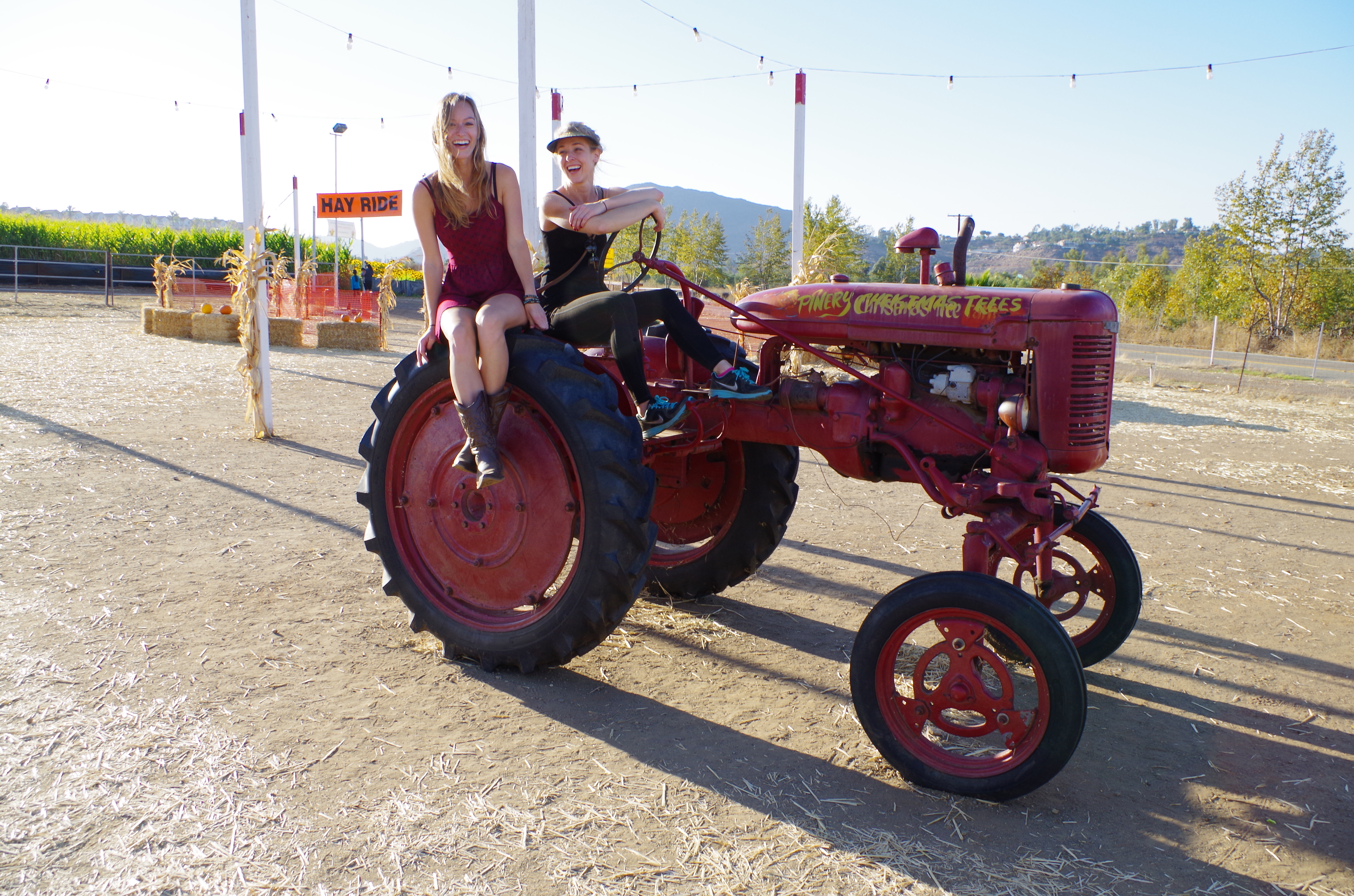 This all leads me to my favorite pumpkin patch in San Diego: Pinery Pumpkin Patch. We were very new to San Diego when we went two years ago, so we may have gotten lost, almost stung by a bee that got stuck in the car, and were very close to turning around, but once we made it, it was seriously the greatest place ever. Mind you, we are all young kids at heart, so this type of place might not be for everyone. Giant pumpkins to choose from, a petting zoo, corn maze, big red tractor to play on, hay ride….need I say more? Yes? Okay, here are some photos WITH the very pumpkin patch like background.