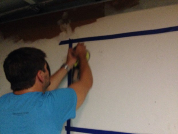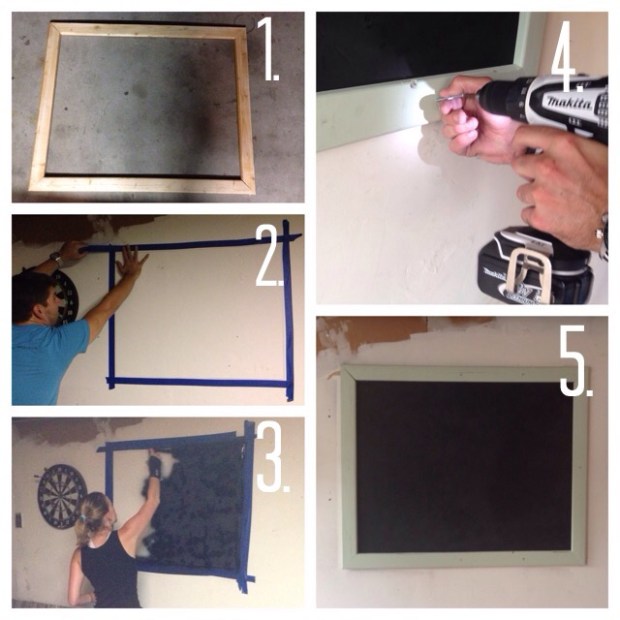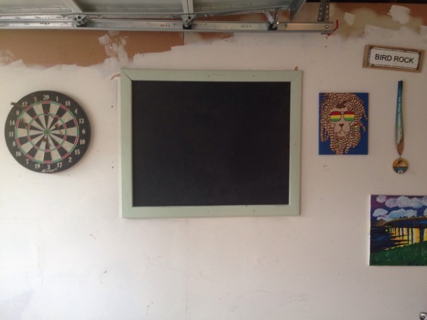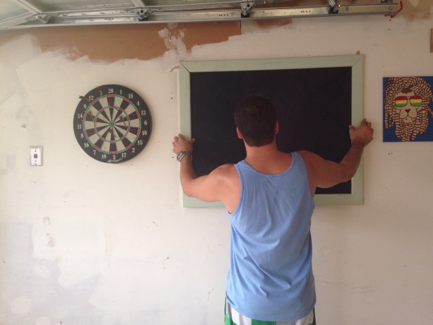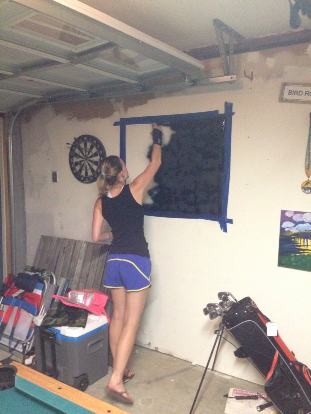 We bought a pool table and a dart board awhile back, but didn’t had anywhere to keep track of scores (and how many times I’ve beat Matt in pool). Matt suggested creating a large chalkboard right on the garage wall. Sold!