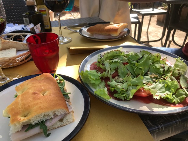 Cafe Corsini in Montalcino. Located somewhere in a small park with some weird dolls in Montalcino, this cafe was cheap, had GREAT food and there were a lot of locals eating there. Yes, the dolls sound weird and they were, but the outdoor cafe is really quite lovely. I got the tartufina (panini with prosciutto, truffle cream, and argula) and braesaola salad (thinly sliced raw beef, salad, pine nuts, tomatoes, and balsamic cream sauce) and was in heaven. Are you drooling yet? Oh and the brunello. Don’t forget the brunello.
