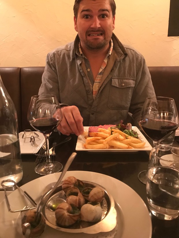 - Escargot. Turns out, not a fan. We ordered half a dozen, tried to thoroughly chew 2 and were unsuccessful. Also had to awkwardly ask the waiter how to get those suckers out of the shell with the clamp. Everyone in the restaurant had a good laugh.