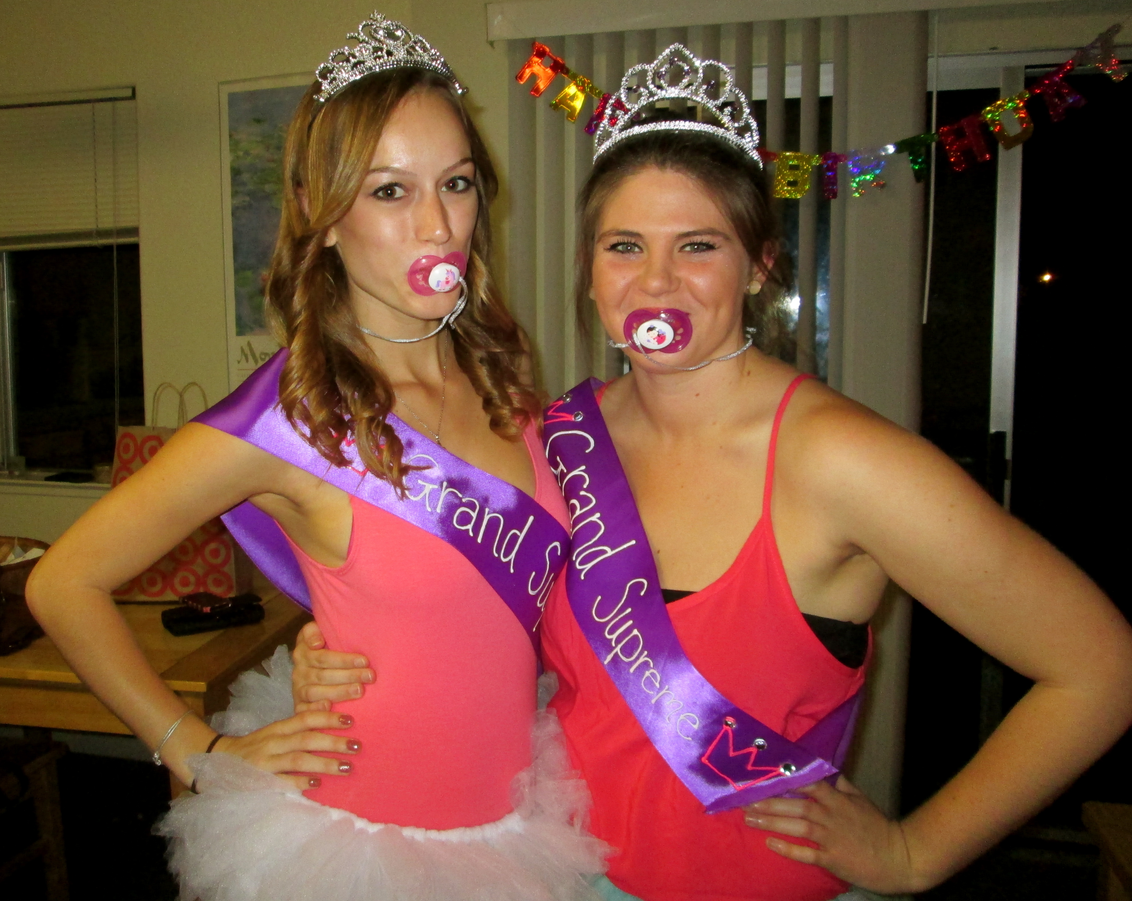 Cut fabric into circles approximately 4 inches in diameter. Hot glue cycles onto shirt, overlapping them. Hot glue sequins on the straps. *If your shirt is stretchy, make sure to put it over a chair or have someone hold their arms inside to stretch it, otherwise the fabric circles will pop off when you put it on. We learned this the hard way!